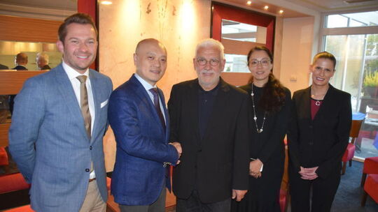 Der Handel ist perfekt: Direktionsberater Simon Schenk (von links), Finanzdirektor Johnson Li, Hotelier Gojko Loncar, Jennifer Wang (rechte Hand der Konzernchefin) und Direktorin Svenja Broton freuen sich. Foto: R. Gräff