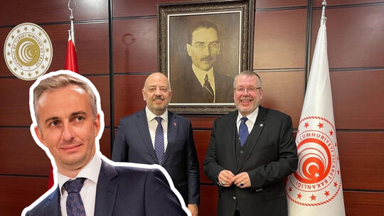 Joe Weingarten (rechts) traf Anfang vergangenen Jahres in Istanbul den stellvertretenden türkischen Handelsminister Riza Tuna Turagay (links). Weingarten war eingeladen worden. Jan Böhmermann (links) wirft dem SPD-Bundestagsabgeordneten vor, zu unkritisch gegenüber dem Erdogan-Regime zu sein. Büro Joe Weingarten, Rolf Vennenbernd/picture alliance/dpa, Svenja Wolf (Grafik)