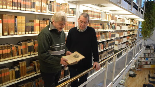 Stolz ist Bibliotheksleiter Julius Reisek darauf, dass sich in den Beständen der Heimatwissenschaftlichen Zentralbibliothek noch etliche der Originalbücher befinden, die Karl Marx in Kreuznach gelesen hat, wie „Patriotische Phantasien“ von Justus Möser, das Autor Jörg Staiber in Händen hält.