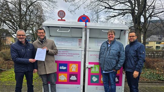 Von links : Peter Ludwig (Diakonie), Oliver Kohl (Kreis Beigeordneter), Stadtbürgermeister Frank Ensminger und Philipp Geib (Werkleiter AWB) freuen sich gemeinsam über die aufgestellten Altkleidercontainer. Sebastian Schmitt