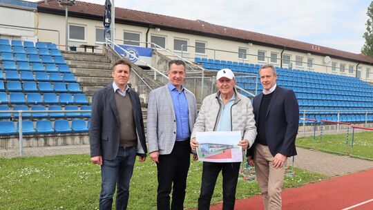 Freuen sich auf die Aufwertung des Moebus-Stadions: Bauamtsleiter Eduard Schuckmann (von links), OB Letz, Stiftungsvorsitzender Theo Suess und Architekt Oliver Schrögel. Sportdezernent Markus Schlosser ist auf dem Foto zwar nicht dabei, er begrüßt das Projekt aber ebenfalls. Foto: Isabel Gemperlein/Stadtverwaltung Isabel gemperlein