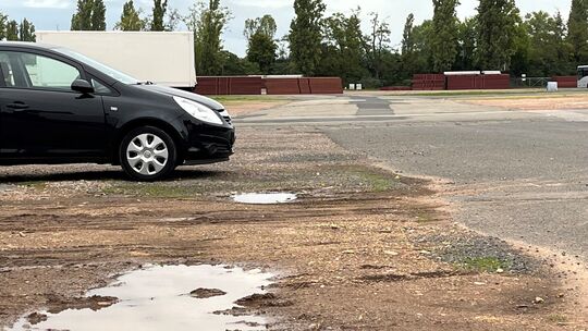 Nach Regenfällen ist die Pfingstwiese von Pfützen übersät. Das soll jetzt anders werden, die Fläche einen neuen Belag bekommen. Denn sie soll ja künftig als gebührenpflichtiger Parkplatz genutzt werden.