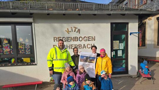 Sven Schäfer, Ortsbürgermeister Karl-Otto Selzer, Kita-Leiterin Jennifer Steinmüller und Erzieherin Madlen Fisher mit Kindern vor der Kita Alte Schule in Becherbach. Sebastian Schmitt