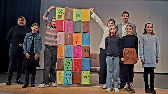 Bildungsminister Sven Teuber inmitten derer, die er in seinem Amt "am meisten vermisst", den Kindern, die ihm gemeinsam mit Lehrerin Dr. Melanie Ehler einen großen Adventskalender gebastelt hatten! Claudia Römer