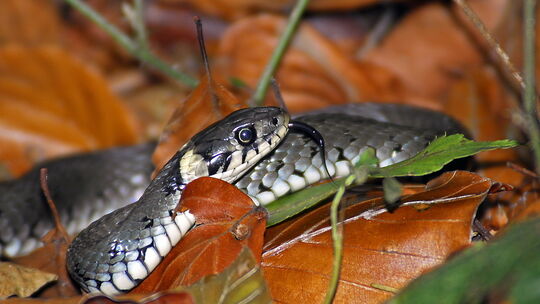 Eine Ringelnatter schlängelt sich durch Laub. Die Ringelnatter ist ein für Feuchtgebiete typisches Tier. Die Schlange braucht diesen Lebensraum, denn sie ernährt sich von Fischen und Fröschen. picture-alliance/ dpa