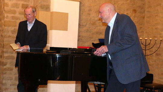 74 Mal hieß es in den vergangenen Jahren seit 2002: „Offenes Singen mit Dirk Papke“. Mit dem 75., einem Weihnachtssingen am 20. Dezember, soll Schluss sein. Der VBW-Vorsitzende Werner Keym (links) würdigte den bisherigen Einsatz des ehemaligen Musiklehrers am Paul-Schneider-Gymnasium. Foto: Roswitha Kexel kx