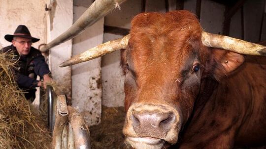 Der Seibersbacher Landwirtschaftsmeister Hans-Willi Planz mit seinem Bullen Adam, auf dem er einst ritt und sich damit bundesweit bekannt machte. Nach seinem schweren Motorradunfall vom 11. Juli 2015, bei dem Planz das linke Bein verlor, ist ans Bullenreiten nicht mehr zu denken. Fotos: Stefan Munzlinger