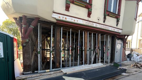 Das ist auch von außen für Passanten auf der Alten Nahebrücke deutlich zu sehen. Ende September wurden an dem mehr als 400 Jahre alten Haus Mannheimer Straße 94 mit der berühmten Schwedenkugel in seinem Gebälk Gefache ausgebaut als Vorbereitung für den Austausch der tragenden Bauteile aus Holz und Stahl.