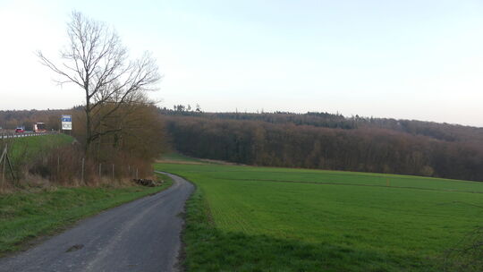 Auf dieser von Wald eingegrenzten Ackerfläche „Im Schwarzenberg“ südlich der Autobahn 61 (links) wird die Freiflächenphotovoltaikanlage entstehen. Jens Fink