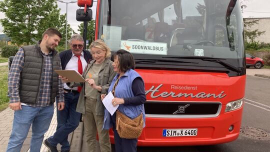 Der Soonwaldbus soll auch zukünftig ein Markenzeichen der Initiative Soonwald bleiben. Die Ehrenvorsitzende Monika Kirschner-Ludwig (2. von rechts) hat angekündigt, dass sie sich außerhalb des neuen Vorstands wieder selbst um dieses Vorzeigeprojekt kümmern will. Knaudt Kurt. Kurt Knaudt