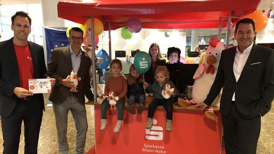 Beim 99. Weltspartag konnten Nachwuchssparer ihre Cents am Kinderschalter im Beratungscenter der Sparkasse am Kornmarkt einzahlen. Jörg Brendel (rechts) Jürgen Sauerwein (Zweiter von links) und Timo Klein (links) verteilten Plüschhühner und Ausmalbögen. Foto: Christine Jäckel chj