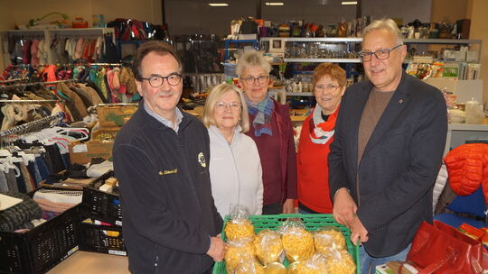Der Lions-Club Kirn-Mittlere Nahe übergab der Tafel in der Kirner Langgasse eine Spende. Armin Dönnhoff aus Meddersheim (von links), Tafel-Vorsitzende Ellen Kriegel, die ehrenamtlichen Helferinnen Ulrike Kloos aus Kirn-Sulzbach, Ingrid Welsch aus Mittelreidenbach und der Weierbacher Lions-Präsident Dirk Pfeiffer strahlten pure Freude aus. Foto: Bernd Hey Bernd Hey