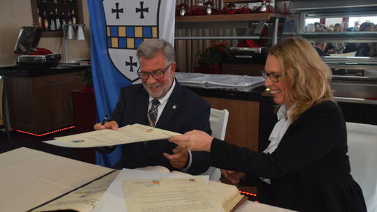 Neuruppins Bürgermeister Golde und die Bad Kreuznacher Oberbürgermeisterin Kaster-Meurer erneuerten die Städtefreundschaft mit neuen Urkunden und einem Eintrag ins Eiserne Buch der Stadt. Fotos: Harald Gebhardt