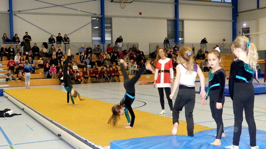Radschlagen und mehr - die Mädchenturngruppen präsentierten ihre Übungen unter Leitung von Nancy Mohr (im rot-weißen Nikolauskleid) und Sebastian Eschmann (nicht im Bild) Roswitha Kexel