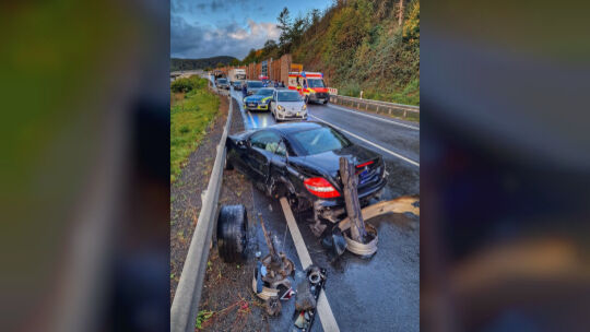 Ein Hyundai war in Richtung Bad Kreuznach unterwegs, stieß dabei mit einem entgegenkommenden Mercedes zusammen. Durch den Aufprall riss es dem Mercedes das linke Hinterrad samt Achsenteile raus, dieser prallte in die Leitplanke.