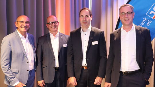 Die Volksbank macht sich zukunftsfit. An die Seite des Vorstandsvorsitzenden Patrick Miljes (rechts) tritt im neuen Jahr Thomas Reins (2. von rechts) und ersetzt Odo Steinmann (links), der im ersten Quartal in Ruhestand geht. Neben ihm steht Aufsichtsratsvorsitzender Andreas Kolb. Foto: Rainer Gräff Rainer Gräff