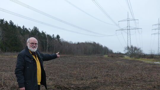 Ex-Ortsbürgermeister Hanspeter Straub an der Stelle, wo das als Hochwasserschutz gedachte Biotop entstehen sollte. Nachdem der Rat dieses Projekt sowie das angedachte Gewerbegebiet abgelehnt hatte, war Straub enttäuscht vom Amt des Ortsbürgermeisters zurück getreten. Jens Fink