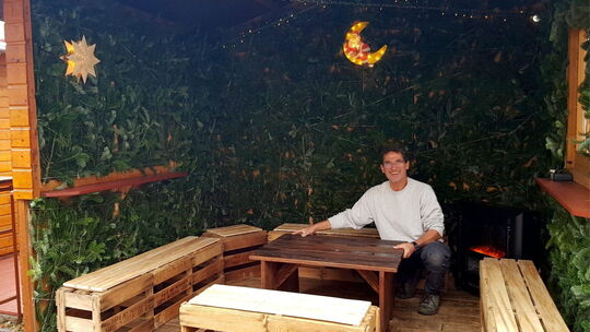 In der Schutzhütte sitzt man jetzt nicht mehr auf Stroh, sondern auf stabilen Kisten und weichen Kissen, die der Weihnachtswirt Harald Kunth besorgt hat. Roswitha Kexel