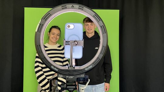 Emilia und Elischa Bäcker vor einem Greenscreen: Die Schüler des Englisch-Leistungskurs der MSS 12 im Gymnasium am Römerkastell nehmen das Thema "Minderheiten in den USA" durch. Dafür produzierten die beiden mit anderen Schülern ein Video, das einer Nachrichtensendung aus den 1960er-Jahren nachempfunden ist, in der es um den amerikanischen Bürgerrechtler Malcom X geht. Cordula Kabasch