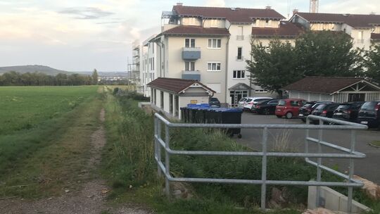 An Stellen wie hier, wo der Winzenheimer Wirtschaftsweg links höher liegt als die Fläche rechts, droht bei Starkregen das Oberflächenwasser über den niedrigen Rand in Richtung Gebäudeeingangstür zu fließen. Foto: Josef Nürnberg Josef Nürnberg