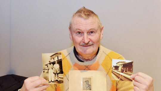Willy Jänig aus Ebernburg präsentiert zwei historische Fotos: Die linke Aufnahme zeigt seinen Vater und Großvater bei der Abreise auf dem Bahnhof Cesenatico (bei Rimini), das rechte Foto hat Jänig 1982 an gleicher Stelle nachgestellt. Norbert Krupp