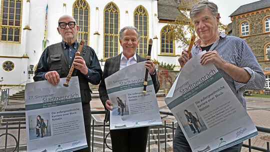 Dorothee Oberlinger steht im Mittelpunkt des 27. Simmerner Stadtgesprächs zu dem Wolfgang Stemann (von links) vom Pro-Winzkino, Stadtbürgermeister Andreas Nikolay und Karl Werner von der Buchhandlung Schatzinsel am 22. November einladen. Am Tag zuvor, 21. November gastiert die Musikerin in der Stephanskirche. Dupuis Werner. Werner Dupuis