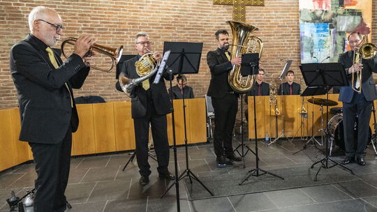 Ausonius Brass verabschieden sich von der Bühne. Das Quintett mit (von links) Günther Sehn (Trompete/Flügelhorn), Hendrik Sartorius (Horn), Dominik Henn (Tuba), Markus Zimmer (Posaune) und Harry Warkentin (Trompete/Flügelhorn) begeisterte in der Friedenskirche in Kirchberg ein letztes Mal seine Anhängerschar. Thomas Torkler