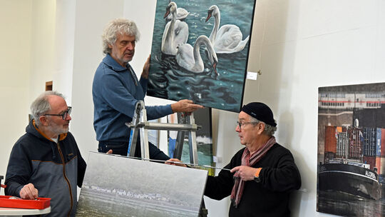 Augenmaß war gefragt bei den Mitgliedern der Künstlergruppe beim Aufbau der Ausstellung im Foyer des Simmerner Schlosses. Werner Dupuis