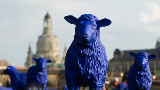 Die blauen Schafe, ein Kunstprojekt von Bertamaria Reetz und Rainer Bonk, standen bereits in vielen Metropolen Europas, etwa in Dresden an den Elbwiesen vor der Frauenkirche. Die sächsische Landeshauptstadt war bereits die 100. Station der Wanderausstellung. Nun sind einige der Tiere auch in Simmern zu sehen. Sebastian Kahnert/dpa