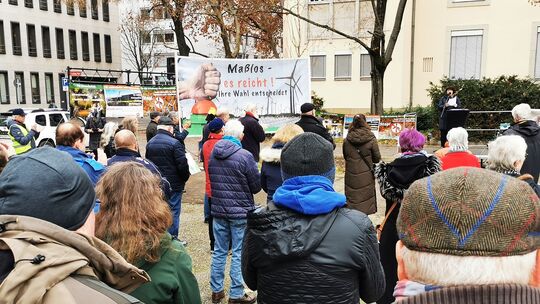 Rund 60 Menschen beteiligten sich an einer Protestaktion in Mainz, zu der ein breites Bündnis aufgerufen hatte. Sie forderten, insbesondere den Sonnwald und den Lützelsoon nicht mit Windkraftanlagen zu bebauen. Charlotte Krämer-Schick