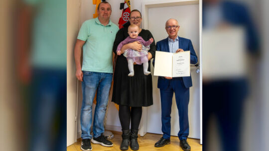 Die kleine Liliana Melia Schneider hat einen besonderen Ehrenpaten: Bürgermeister Jörg Haseneier (rechts) überreichte ihren Eltern Manuela und Andreas Schneider eine Urkunde über die Ehrenpatenschaft des Bundespräsidenten Frank-Walter Steinmeier. Stadt Boppard. Denise Bergfeld