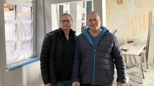 Conni und Roberto Iannitelli verbringen aktuell viel Zeit auf der Großbaustelle. Sie sind optimistisch, dass sie ihr Eiscafé am historischen Marktplatz von Kirchberg zum Saisonbeginn wieder öffnen können. Charlotte Krämer-Schick