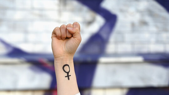 Symbolfoto: Eine Frau hebt auf einer Veranstaltung zum Weltfrauentag ihre Faust in die Höhe. Auf ihrem Arm ist das Venussymbol zu sehen, das für das weibliche Geschlecht und Frauenrechte steht. Am Beratungstag "Frau und Beruf" will die Initiative Gelobtes Land Frauen bei ihrer beruflichen Weiterentwicklung im Rhein-Hunsrück-Kreis unterstützen. Elisa Schu. picture alliance/dpa