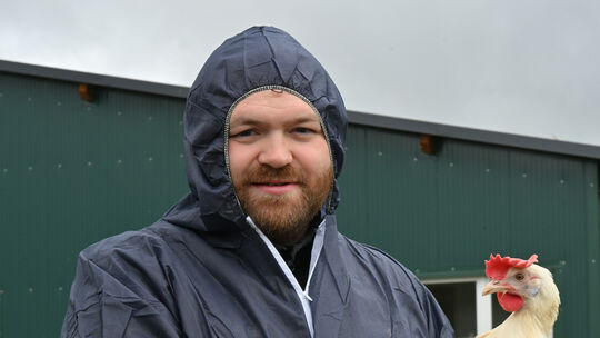 Nur noch im Schutzanzug betritt Chris Mayer seinen Hühnerstall in Riegenroth.Fremde haben derzeit keinen Zutritt. Werner Dupuis