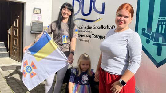 Melanie Gras hält eine Flagge der ukrainischen Feuerwehr in der Hand. Die 31-jährige Anastasia und ihre vierjährige Tochter sind dankbar, dass sie bei Familie Gras wohnen können. Andreas Nitsch