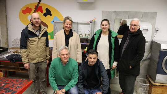 Freuen sich über das neue Projekt der „Offenen Werkstatt" (hinten, von links): Andreas Nick, Ortsvorsteher von Bad Salzig, Barbara Lautwein-Gromes, Schulleiterin der Grundschule Bad Salzig, Laura Tepecik und Matthias Koch, ehrenamtliche Helfer sowie Rolf Dreier, der Initiator des Projekts (vorne links) und Gökhan Tepecik, der in seinem Dönerladen die "Bibliothek der Dinge" beherbergt. Lara Kempf