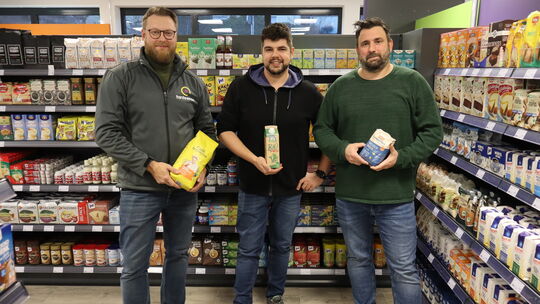 Viktor Fröscher, Regionalleiter bei Tante Enso (links), Max Wiersch, Initiator des Projektes (Mitte), und Jörg Kabelitz, Bürgermeister von Mastershausen (rechts), fiebern der Eröffnung des Mini-Supermarktes entgegen. Lara Kempf