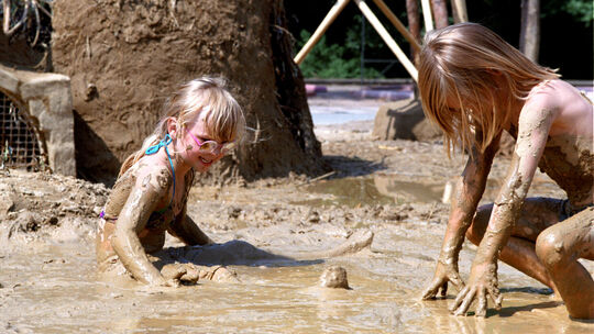 Zwei Mädchen wühlen im Schlamm. Kinder, die nicht in so sterilen Verhältnissen aufwachsen und auch mal im Dreck spielen dürfen, sind weniger anfällig für Allergien, Asthma und Neurodermitis. Bernd Settnik/dpa. picture alliance / dpa