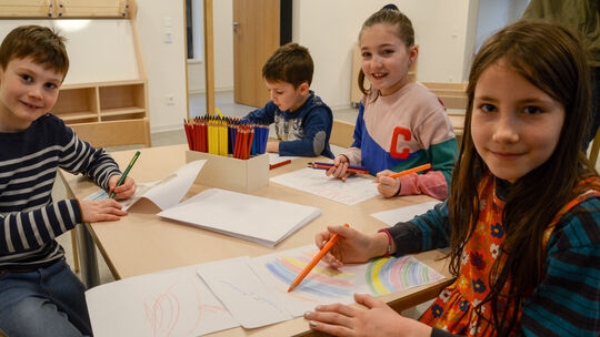 Bei der feierlichen Einweihung der Kita Sternensegler erkundeten natürlich auch viele künftige Kitakinder und ihre Geschwister den Neubau. Jakob (großes Bild von links) Lukas, Clara und Eileen malen im oberen Stockwerk.