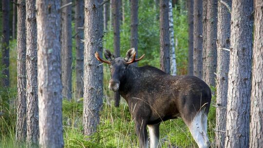 Befinden sich die Elche in der Brunftzeit, gelingt es mit geduldigem Warten und Imitieren der Lockrufe der Elchkühe, scheue Bullen wie diesen Stangler mit Stangengweih zu Gesicht zu bekommen. Schaufler mit prächtigerem Geweih finden sich in der Region selten.