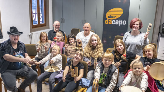 Die Da Capo Kids freuen sich mit ihrem Chorleiter Matthäus Huth (links) über die Schlaginstrumente aus der Rhythmik-Kiste, die die Mörschbacher im Rahmen des Jugend-Engagement-Wettbewerbs Rheinland-Pfalz gewonnen haben. Foto: Thomas Torkler Torkler Thomas. Thomas Torkler
