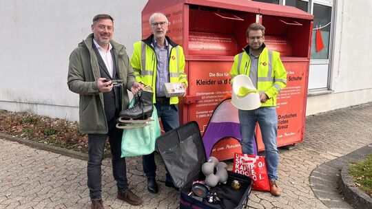 DRK-Vorsitzender Thomas Bolling (von links) sowie Thomas Lorenz und Tobias Fichtel von der Rhein-Hunsrück Entsorgung wundern sich immer wieder darüber, welche Kuriositäten in den Altkleidercontainern landen. Diese Fundstücke sind nicht nur ärgerlich, sondern rauben auch Zeit und verursachen Kosten. Letztendlich geht dies zulasten des Gebührenzahlers. Andreas Nitsch