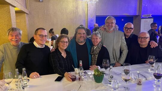 Sieben Pro-Winzler sind zur Presiverleihung nach Karlsruhe gereist. Dort gab es ein freudiges Wiedersehen: Der ehemalige Leiter der Heimat Europa Filmfestspiele, Urs Spörri (4. von links), moderierte den Abend. Wolfgang Stemann/Pro-Winzkino