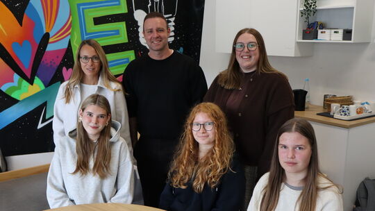 Zum Konzept "Schule der Zukunft" gehört auch das Lernen in Stufenteams, den sogenannten Lernhäusern. Patricia Schreiner (hinten, rechts) leitet das Lernhaus der Klassenstufen 5 und 6, Jessica Volz (hinten, links) ist für das Lernhaus der Klassenstufen 7 und 8 verantwortlich und Volker Schambach (hinten, Mitte) arbeitet mit den Klassenstufen 9 und 10. Auch die Schülerinnen (von links) Lina Hortian (Klasse 10), Vivien Kaschner (Klasse 10), und Sophia Basgal (Klasse 8) bewerten das neue Schulkonzept bis jetzt positiv. Lara Kempf
