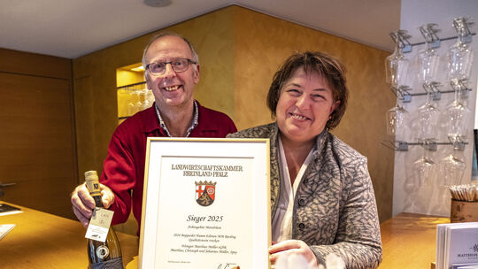 Kontinuität im Spayer Weingut: Matthias Müller und Ehefrau Marianne präsentieren stolz die Urkunde der Landwirtschaftskammer Rheinland-Pfalz für den Siegerwein 2025 des Anbaugebiets Mittelrhein, ein Riesling Qualitätswein trocken. Auch für den Vorjahresjahrgang dieses Weins hatte der renommierte Betrieb bereits die Spitzenbewertung von der Kammer erhalten. Thomas Torkler
