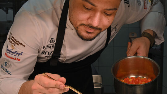 Liebe zumDetail: Mit der Pinzette garnierte Maget Megala, zweiter Küchenchef auf Schloss Rheinfels das Rinderfilet. Dupuis Werner. Werner Dupuis