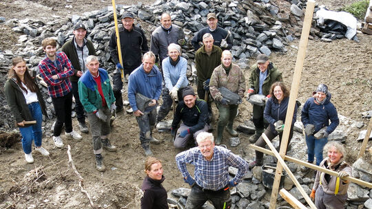 Helge Ehmann wuchtet einen großen Bruchstein aus Schiefer über die gespannte Maurerschnur und setzt ihn an den Platz, den er für ihn vorgesehen hat. Er ruckelt den Stein zurecht, bis die vordere Kante in einer Flucht mit den anderen Steinen sitzt und nichts mehr wackelt.