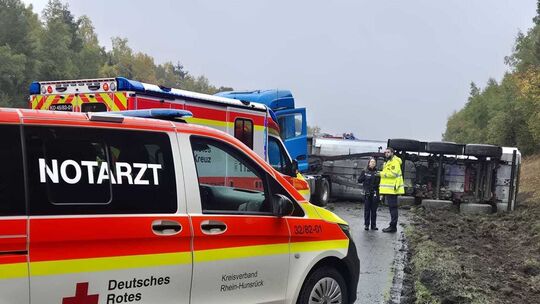 Am Montagmorgen kam es zu einem Unfall auf der A 61 in Fahrtrichtung Süden. Aus bisher ungeklärter Ursache kippte zwischen den Abfahrten Laudert und Rheinböllen ein Lkw um.