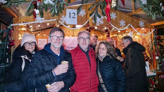 Gutgelaunte Marktbesucher stehen vor einem der prächtig geschmückten Holzhäuschen. Die schönsten davon wurden von der Stadt prämiert. Dieter Diether