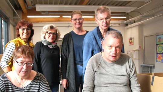 Guido Zaunmüller (vorn rechts) ist bereits seit 40 Jahren bei den Rhein-Mosel-Werkstätten. Das Team aus Betreuungskräften und Kollegen ist in dieser Zeit zu seiner Familie geworden. Sina Ternis